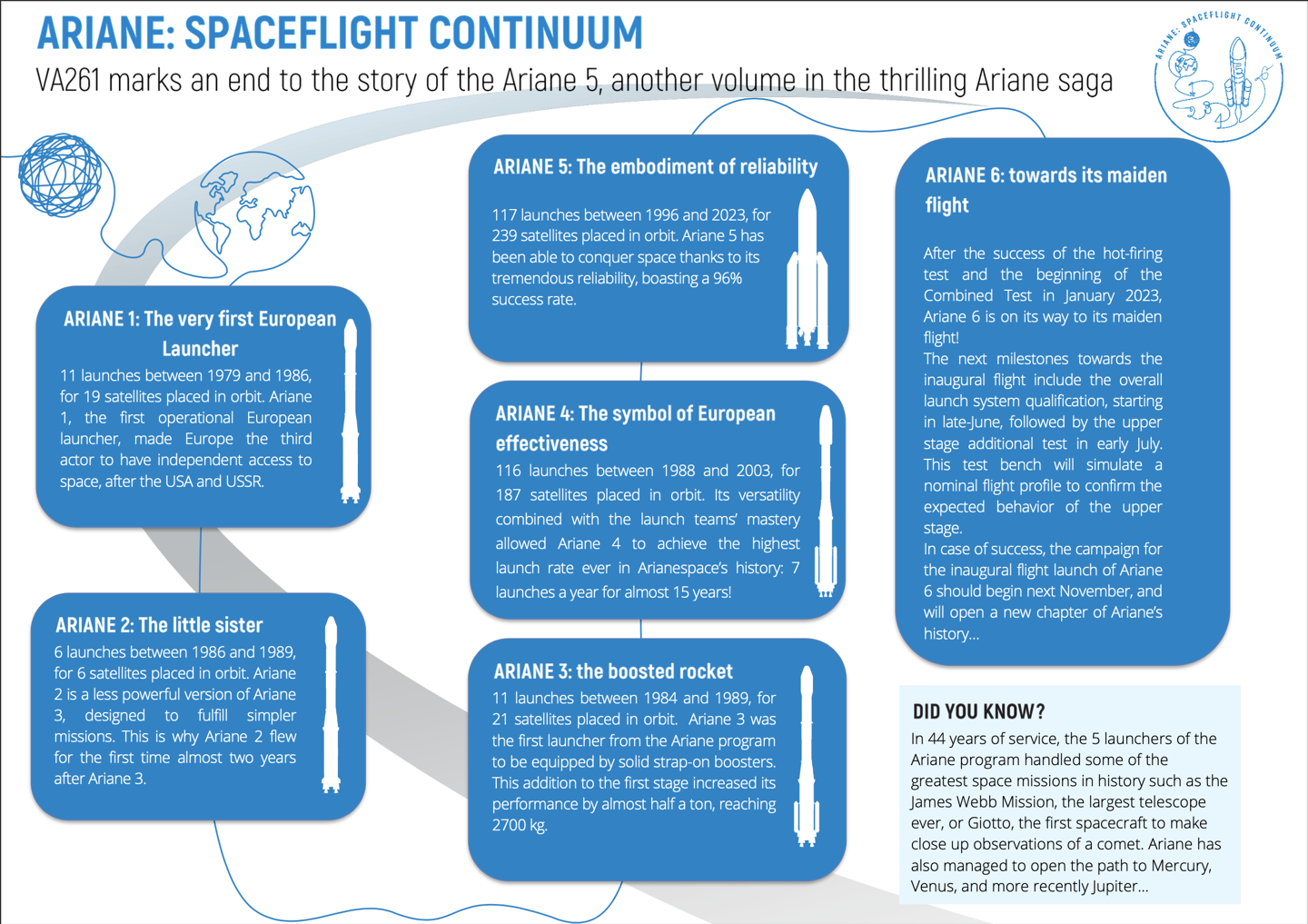 欧空局(ESA)发言人表示,“阿丽亚娜 5 号留下了令人难以置信的技术实力和可靠遗产。在其运营寿命期间,阿丽亚娜 5 号一直是欧洲确保其自主进入太空的重要资产。” 该系列火箭由总部位于法国的阿丽亚娜空间公司为 ESA 和法国国家空间研究中心 (CNES) 负责,由空客防务与航天公司制造,之前已经经历了多次升级。 最新的版本,即阿丽亚娜 5 EC / A 和 ES, 于 2009 年投用,而其前身设计,即阿丽亚娜 G5 于 2005 年至 2009 年进行了多次发射,再往前的 G + 版本只在 2004 年发射了三次任务,而初代型号阿丽亚娜 5 G 也是硕果累累。 阿丽亚娜 5 号系列火箭于 1996 年进行了首次发射,但未能在首飞中进入轨道,最终自动销毁。在初步失败后,该系列火箭便成为了世界上最可靠的发射器之一。 根据 ESA 的数据,阿丽亚娜 5 号的 117 次任务和 239 个有效载荷中成功率达到了 96%,而阿丽亚娜 5 号替代品阿丽亚娜 6 的开发已经进行了十多年。 ESA 代表说“阿丽亚娜 6 是一种新的发射系统,将比阿丽亚娜 5 更灵活、更经济,能够为更多类型的发射提供服务”。 这款新型火箭包括两种配置:A62 和 A64,分别搭载两个和四个固体火箭助推器。这款新型重型运载火箭最初预计于 2020 年首飞,但由于一系列挫折不断推迟,现在预计最早将于 2023 年底之前发射。 欧空局一位官员表示:“必要时,欧空局会从技术、进度和安全角度对替代发射器进行了调查和评估,以确保欧洲项目服务的连续性。” 今年 4 月还有报道称,欧盟委员会正在考虑使用 SpaceX 猎鹰重型火箭发射部分欧盟伽利略导航卫星的可能性,而不是一直等待阿丽亚娜 6 号上线。对此,欧空局发言人表示:“欧空局及其合作伙伴正在努力确保阿丽亚娜 6 号能够尽快并可靠地完成首飞,而这款火箭仍然是需要重型运载火箭的欧洲任务的发射首选。” |