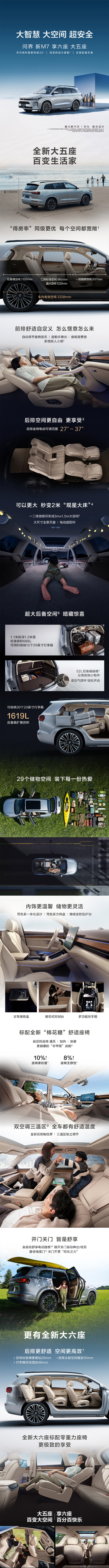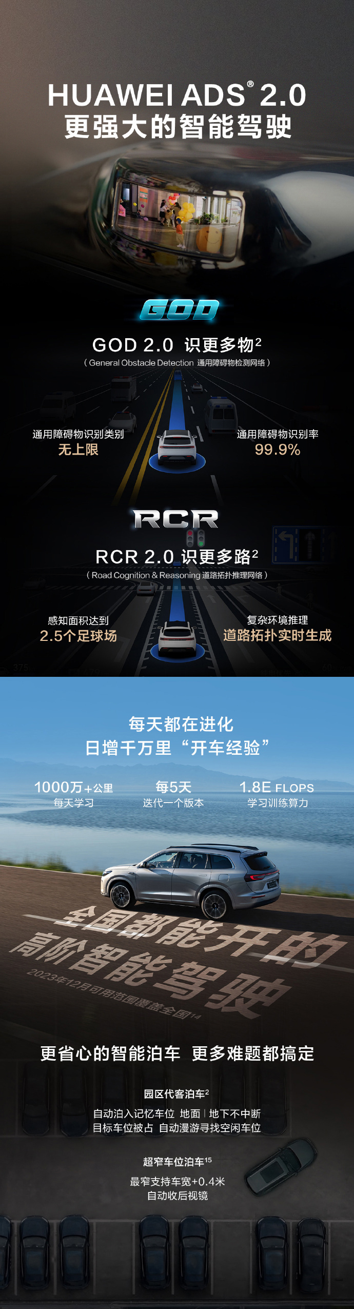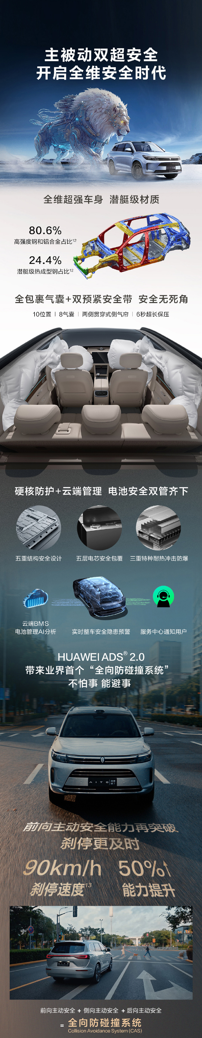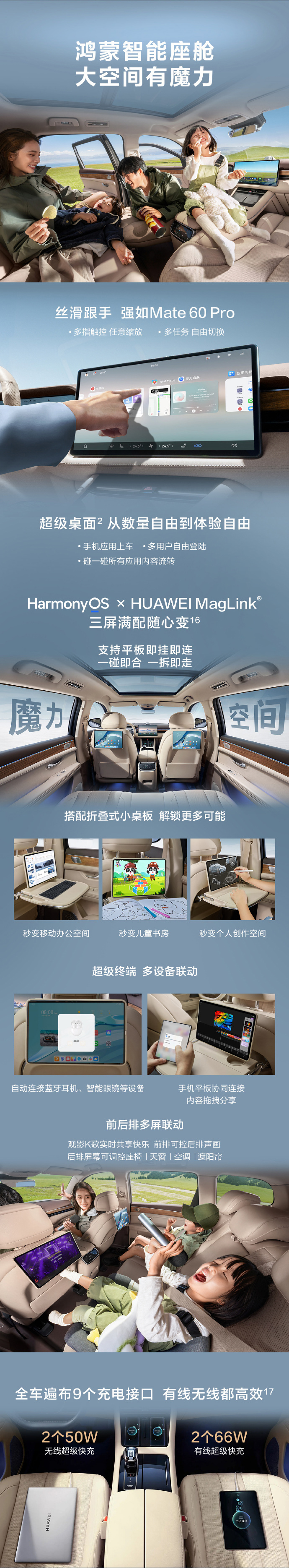 空间方面,问界新 M7 车内有效空间 3338mm,号称高于理想 L7 Max、宝马 X5L、奔驰 GLE 450 等车型,实现同级领先。后备箱纵深超过 1.1 米,标准容积可达 686L,能够容纳 12 个 20 英寸登机箱,并“暗藏惊喜”:配有 52.2L 后备箱暗格。 新车拥有更灵活的座位布局,前中后三排整体空间可达 2605mm,六座版车型拥有 188L 后备箱标准容积。放倒后排座椅之后,空间可拓展至 775L。 智能驾驶方面,问界新 M7 搭载华为 ADS 2.0 高阶智能驾驶系统,可实现不依赖高精地图的高速、城区智能驾驶,并号称预计今年 12 月城区 NCA 实现“全国都能开”。新车配备 1 个顶置激光雷达、3 个毫米波雷达、11 个高清视觉感知摄像头及 12 个超声波雷达等 27 个感知硬件,支持园区代客泊车、超窄车位泊车。 安全方面,全车潜艇级热成型钢占比 24.4%、高强钢和铝合金占比 80.6%,全系标配 8 安全气囊、前排双预紧安全带。此外,HUAWEI ADS 2.0 首发全向防碰撞系统,实现前向、侧向和后向全向防碰撞能力,AEB 最高刹停时速提升至 90km/h,官方称可减少 90% 因注意力不集中和路况复杂造成的交通事故。 舒适性配置方面,问界新 M7 大五座车型标配“棉花糖”座椅,每个座椅都标配通风、加热、按摩功能,六座版车型则配备了零重力座椅。此外,问界新 M7 还配备了前后双空调箱、17 个空调出风口、后排空调触控大屏、全自动舒享电动踏板等多项舒适性配置。 智能座舱方面,新车配备“超级桌面”,手机碰一碰即可完成 App 流转屏幕,小艺语音也支持离线语音导航、语音操控拍照、无需下车即可支付等多种功能。新车前排座椅后部还配备了面向后排的 MagLink,可吸附华为平板电脑,并实现多设备联动,号称打造“移动的全屋智能”:智能座舱可依个人需求变为个人创作室、多人会议室、儿童书房。