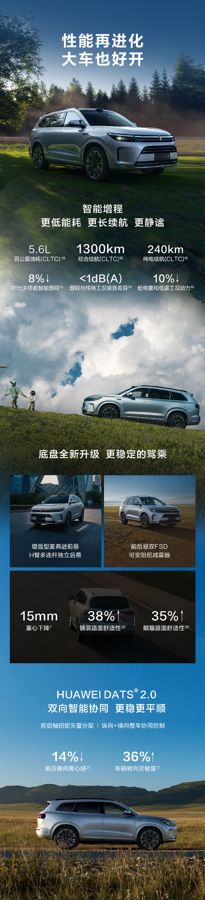 动力及驾控方面,新车升级华为 DATS 2.0 和前后悬双 FSD 可变阻尼减震器,并搭载 DriveONE 增程电驱平台,四驱车型百公里加速时间为 4.8 秒。满油满电状态下,新车综合续航可达 1300km,纯电续航 260km,百公里亏电油耗 5.6L。