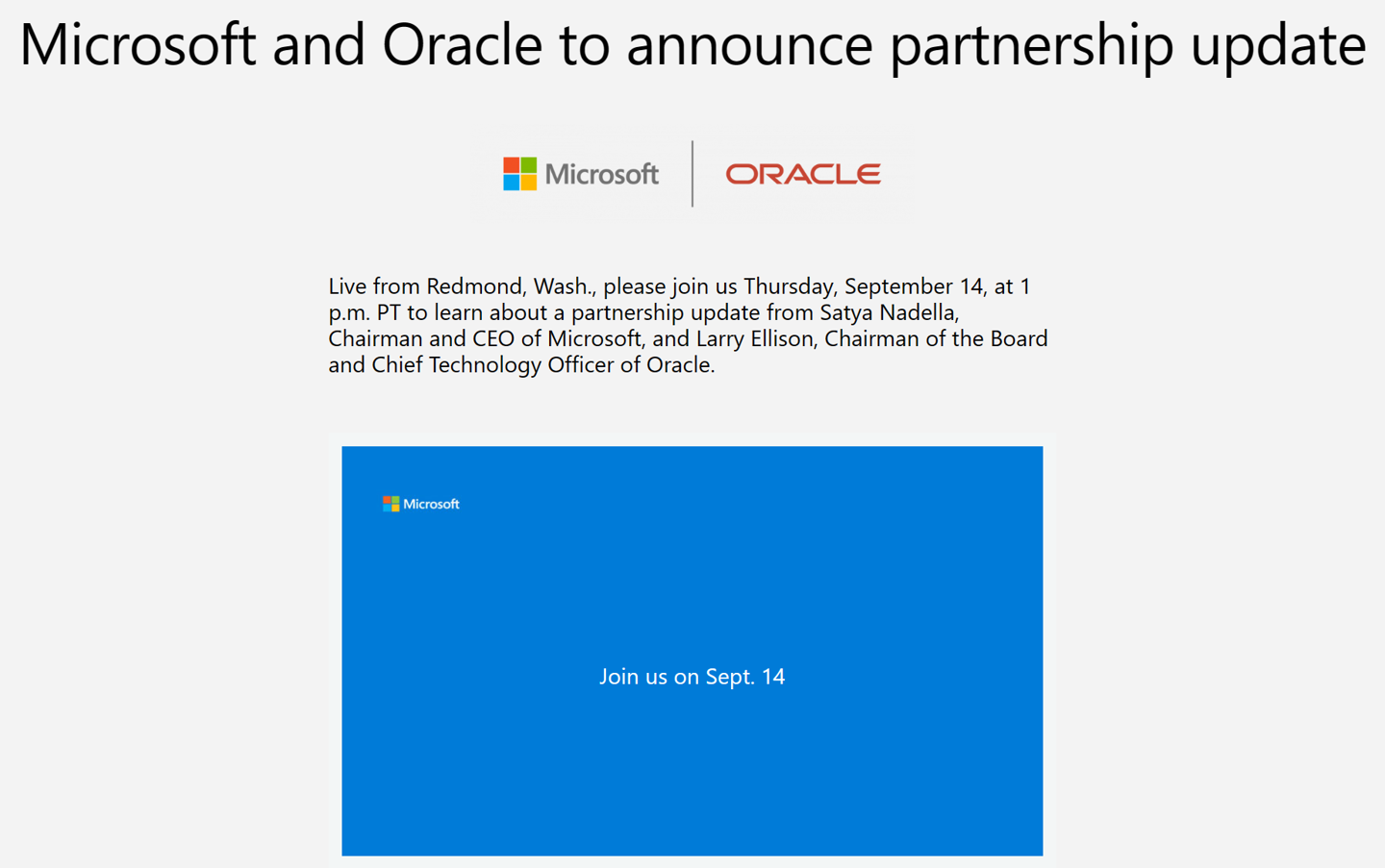9 月 13 日消息,微软官网日前上线了一则媒体公告,微软和甲骨文(Oracle)将于当地时间 9 月 14 日星期四下午 1 点(注:北京时间 9 月 15 日凌晨 5 点)发布最新的合作消息。