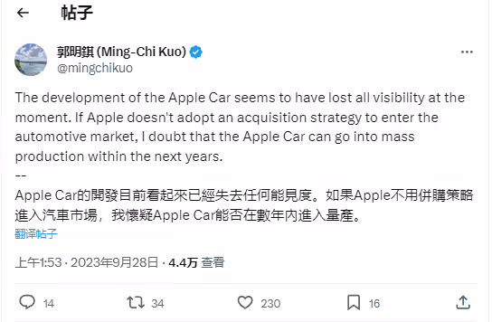 9 月 28 日消息,天风证券分析师郭明錤今天发布推文,表示苹果汽车项目现阶段已经“销声匿迹”,如果想要在“未来几年内投产”,那么最佳的方案就是通过收购车企,利用现有方案进入汽车市场。
