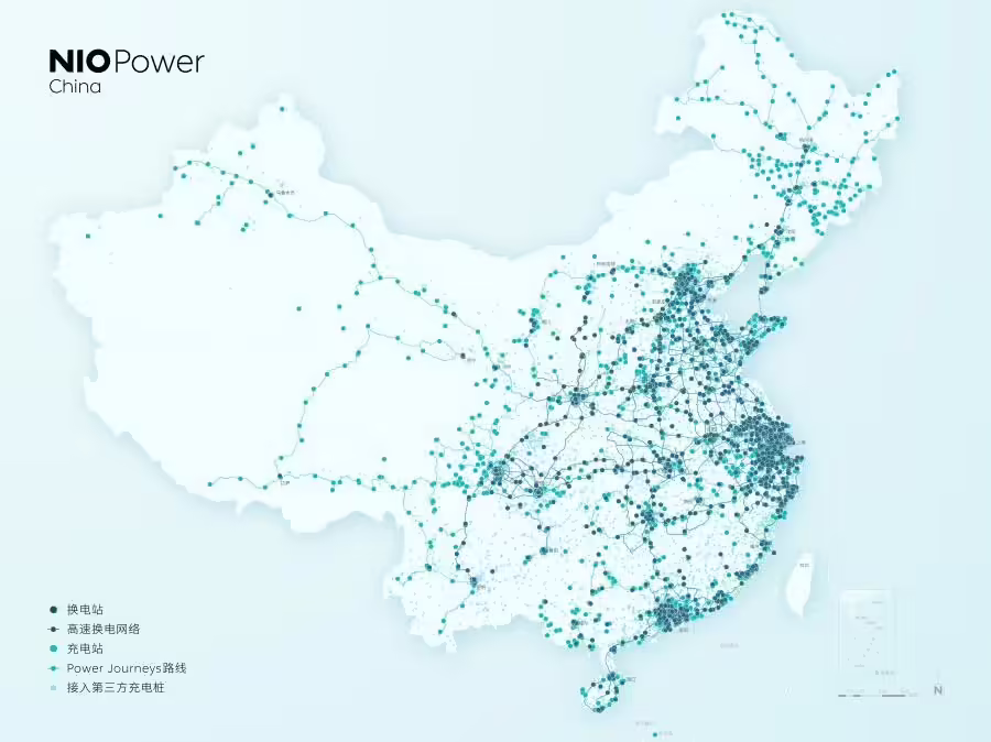 从蔚来官方获悉,截至今年 9 月 30 日,蔚来已在全球累计布局 137 家蔚来中心(海外 6 家)、304 家蔚来空间(海外 9 家)、303 家蔚来服务中心(海外 48 家)、59 家蔚来交付中心、1955 座换电站(海外 26 座)、3227 座充电站(海外 10 座)、18804 根充电桩(海外 33 根),接入 1390000 + 根第三方充电桩(海外 500000+)。