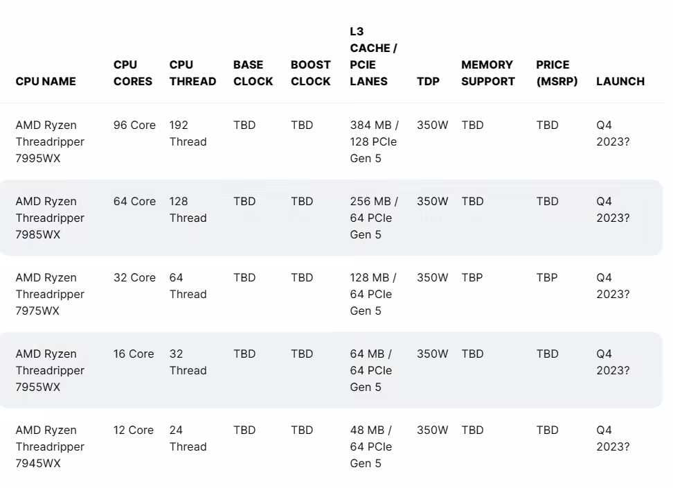 根据此前泄露的信息汇总,AMD 线程撕裂者 PRO 7000 系列预计共有五个型号,包括 96 核 7995WX、64 核 7985WX、32 核 7975WX、16 核 7955WX 和 12 核 7945WX,所有芯片的最大 TDP 额定值为 350W。