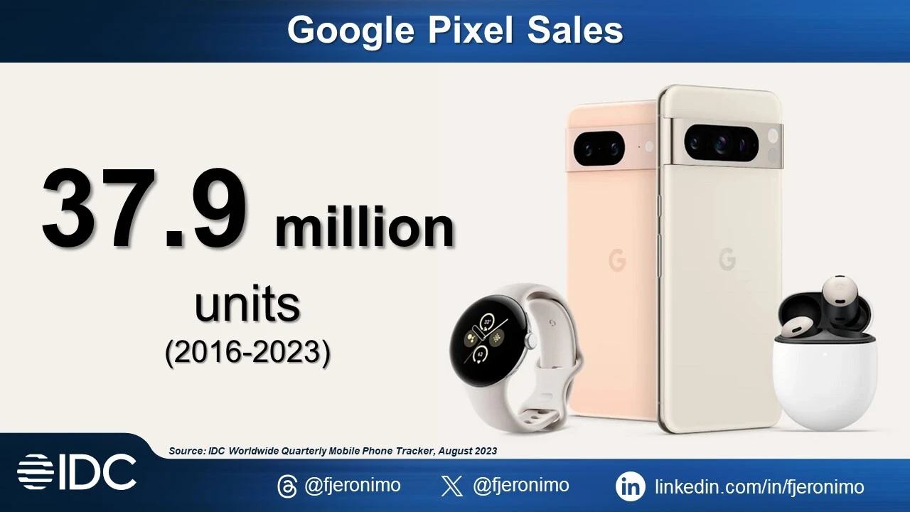 2016 年,谷歌改变了策略,用新的 Pixel 系列手机取代了 Nexus 手机。而现在我们已经来到了 2023 年,Pixel 8 系列刚刚在本周发布。 根据 IDC 数据与分析副总裁 Francisco Jeronimo 发布的一条推特,从 2016 年到 2023 年,Pixel 手机的销量达到了 3790 万部。相比之下,苹果仅在 2023 年前两个季度就销售了 9770 万部 iPhone。尽管如此,Pixel 经常被视为谷歌对抗 iPhone 的产品。