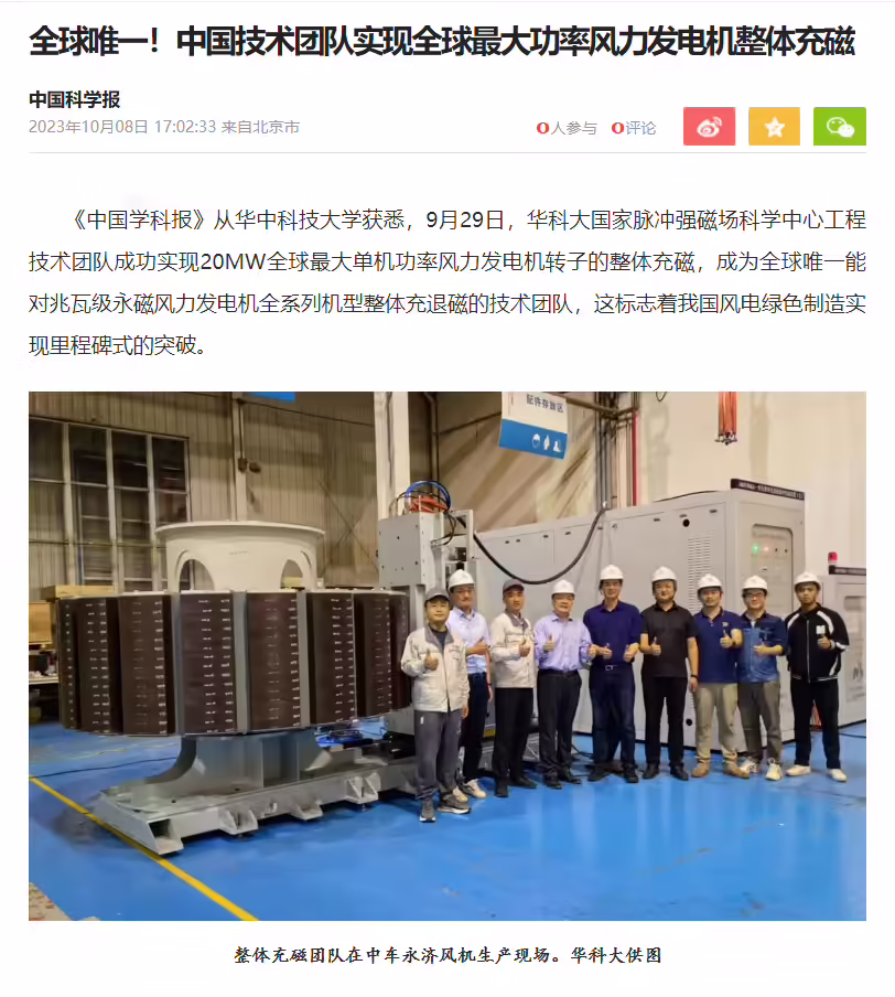 10 月 9 日消息,据《中国学科报》从华中科技大学获悉,9 月 29 日,华科大国家脉冲强磁场科学中心工程技术团队成功实现 20MW 全球最大单机功率风力发电机转子的整体充磁,成为全球唯一能对兆瓦级永磁风力发电机全系列机型整体充退磁的技术团队,这标志着我国风电绿色制造实现里程碑式的突破,对助推中国风电绿色制造高质量发展具有重要意义。