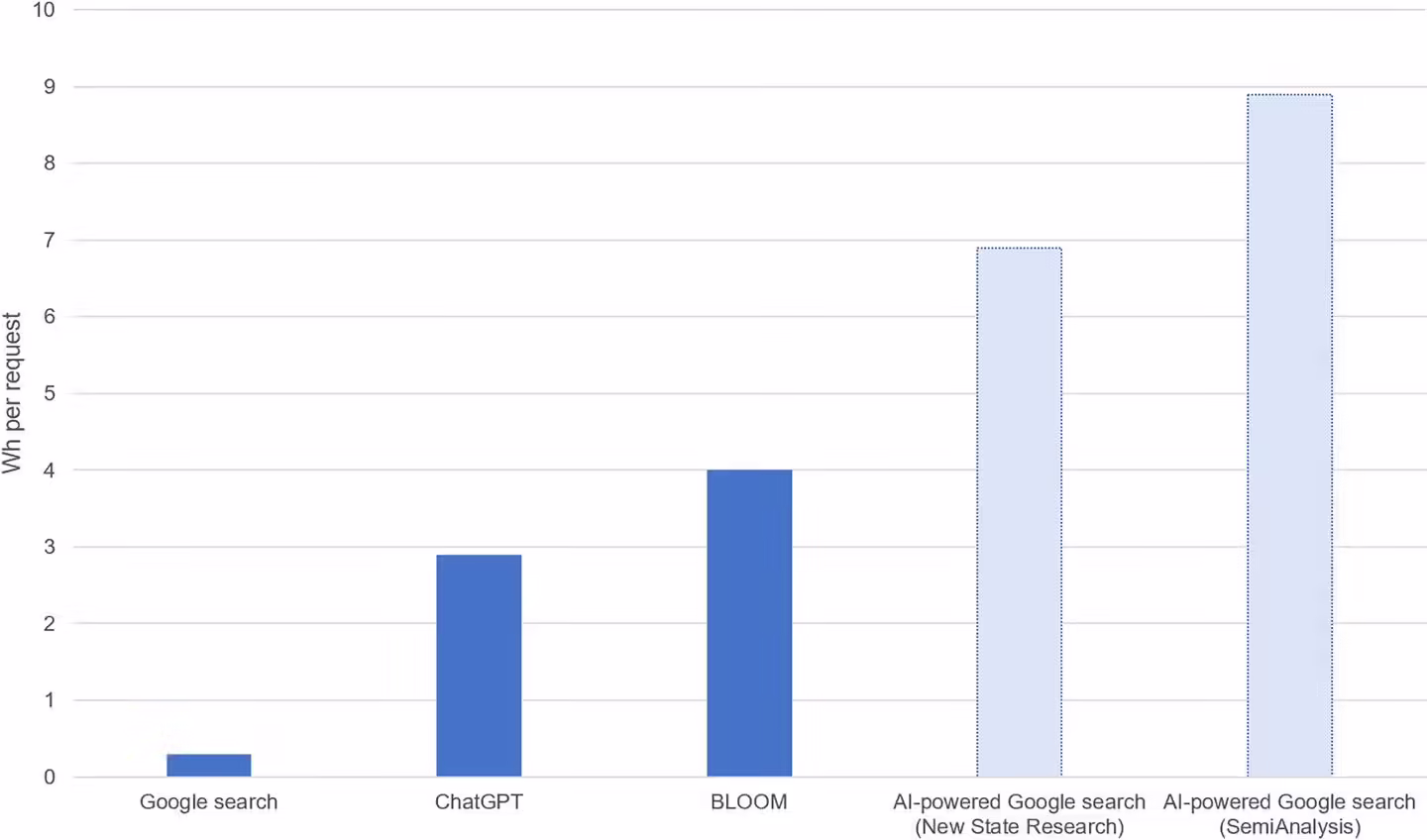 该论文作者,来自阿姆斯特丹自由大学的亚历克斯・德弗里斯表示:“考虑到对人工智能服务不断增长的需求,未来几年与人工智能相关的能源消耗很可能会显著增加”,该研究强调到 2027 年,生成式人工智能所消耗的能源可为一个小国家提供一年的电力,相当于约 85-134 太瓦时 (TWh) 的电力。 总部位于纽约的人工智能开发公司 Hugging Face 报告称,其多语言文本生成人工智能工具在训练期间消耗了约 433 MWH,足以为 40 个普通美国家庭提供一年的电力。 人工智能的能源足迹并不会随着训练而结束。德弗里斯的分析表明,当该工具投入工作(根据提示生成数据)时,每次该工具生成文本或图像后,它也会使用大量的计算能力,从而消耗大量的能源。例如,ChatGPT 每天的运行费用可能为 564 MWh。 谷歌已经将生成式人工智能纳入公司的电子邮件服务中,并正在测试利用人工智能为其搜索引擎提供动力。目前该公司每天处理多达 90 亿次搜索。根据数据,德弗里斯估计,如果谷歌每次搜索都使用人工智能,每年大约需要 29.2 TWh 的电力,相当于爱尔兰一年的用电量。