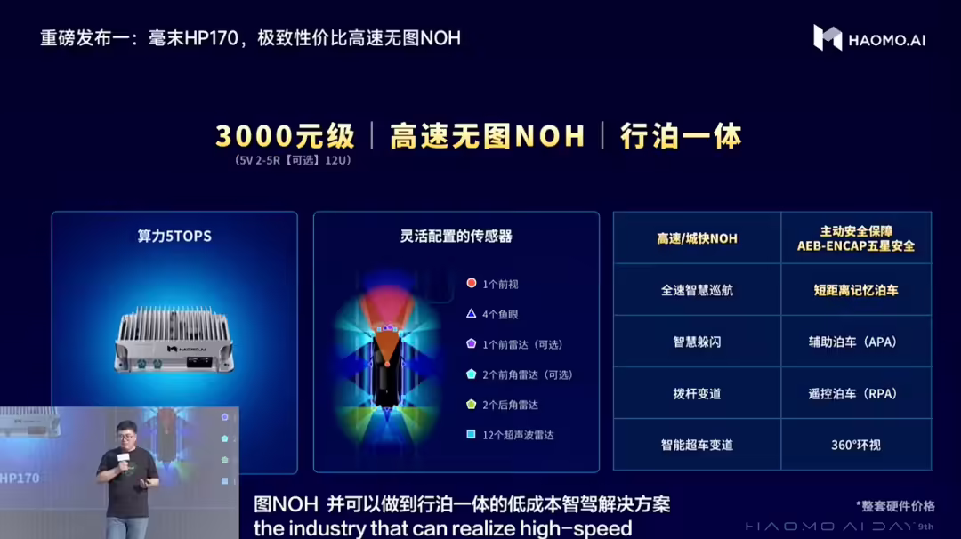 毫末董事长张凯表示:“毫末全新发布的第二代 HPilot 乘用车辅助驾驶三款产品,价格打下来的同时性能都打了上去,让中阶智驾便宜更好用,让高阶智驾好用更便宜。” 据官方介绍,毫末 HP170 是 3000 元级“极致性价比”的高速无图 NOH,可以实现行泊一体智驾。硬件配置上,算力 5TOPS,传感器方案标配 1 个前视相机、4 个鱼眼相机、2 个后角雷达、12 个超声波雷达,灵活选装 1 个前视雷达和 2 个前角雷达。场景上,可实现高速、城市快速路上的无图 NOH,以及短距离记忆泊车等功能,并获 E-NCAP 5 星 AEB 的高安全标准认证。