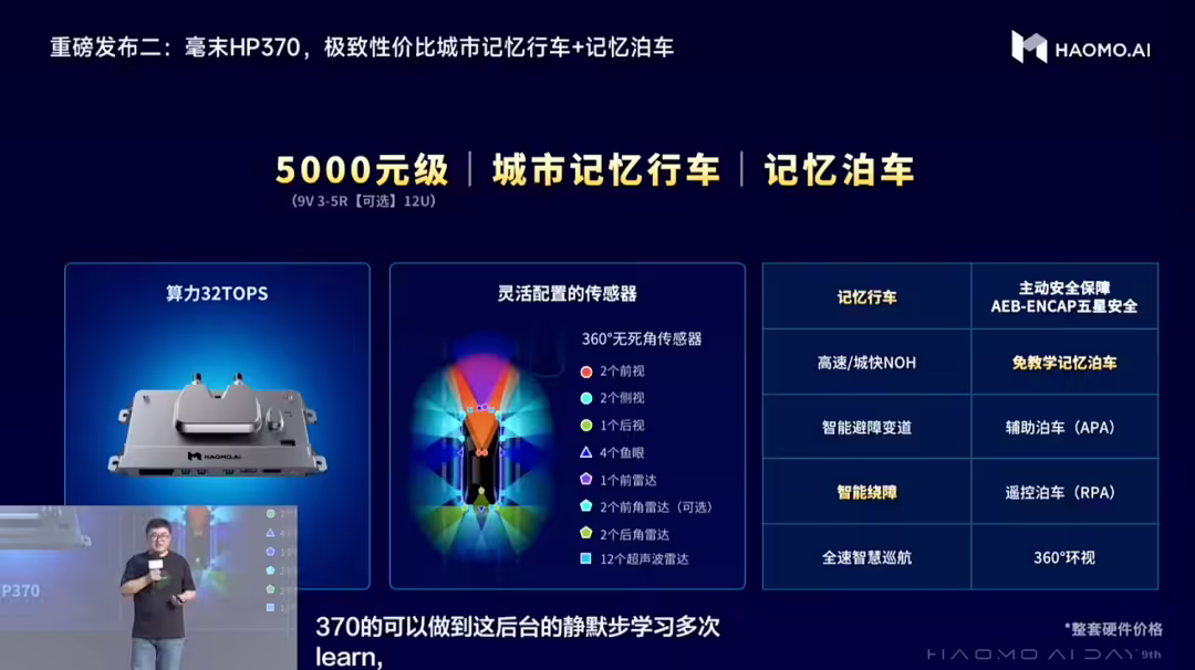 毫末 HP370 是 5000 元级“极致性价比”的城市记忆行车与记忆泊车产品,可以实现行泊一体智驾。硬件配置上,算力 32TOPS,传感器方案标配 2 个前视相机、2 个侧视相机、1 个后视相机、4 个鱼眼相机、1 个前雷达、2 个后角雷达、12 个超声波雷达,灵活选装 2 个前角雷达。场景上,可实现高速、城快,以及城市内的记忆行车,实现免教学记忆泊车、智能绕障等功能。