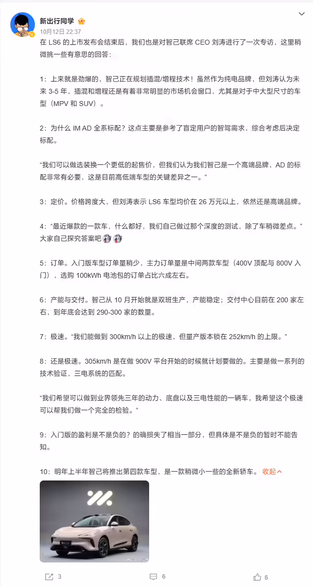 10 月 13 日消息,在昨晚发布了轿跑 SUV 新车 LS6 之后,智己汽车联席 CEO 刘涛开展沟通会。