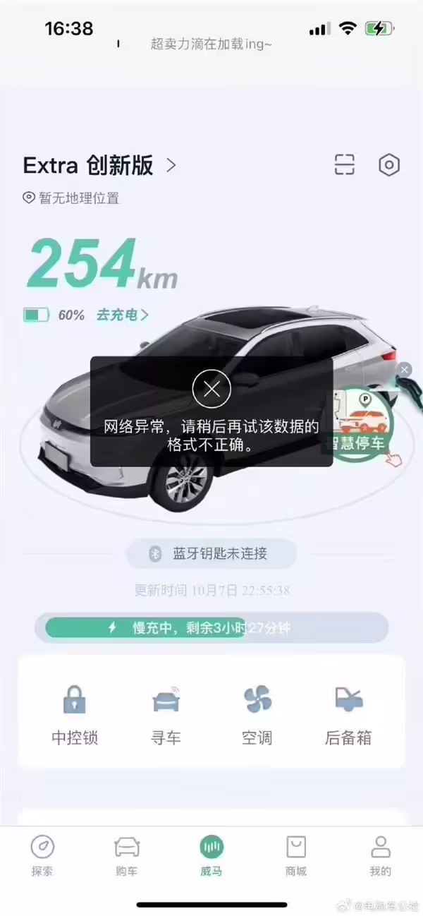 附前情提要如下: 近日有博主爆料威马车主反映称,威马汽车的配套软件“威马智行” 和“小威随行”蓝牙钥匙和远程控车功能均无法使用,显示网络异常,疑似后台已停服。 据车主提供的照片显示,手机 App 界面显示“网络异常”,车辆的车机界面类似无网络状态,加载不出任何信息。