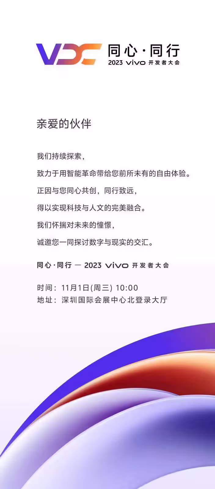 vivo 在本大会邀请函中称:“我们持续探索,致力于用智能革命带给您前所未有的自由体验。正因与您同心共创,同行致远,得以实现科技与人文的完美融合我们怀揣对未来的憧憬,诚邀您一同探讨数字与现实的交汇。”