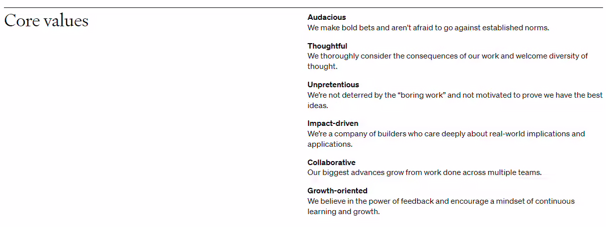 根据媒体 2022 年 9 月 25 日的截图,OpenAI 招聘页面列出了六个核心价值观供其员工遵循,分别是大胆、深思熟虑、谦逊、重视影响、团队合作和注重成长。但是,现在这些价值观已经被替换为五个新的价值观,其中“聚焦 AGI(AGI focus)”排在第一位。OpenAI 官网写道: 我们致力于构建安全、有益的 AGI,这将对人类未来产生巨大的积极影响。不符合这个目标的一切都不在我们的考虑范围内。 剩下四个价值观分别为激烈而顽强、规模化、创造用户喜爱的东西和团队精神。