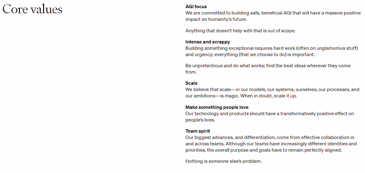 10 月 16 日消息,近日 OpenAI 悄然更改了其“核心价值观”列表,将之前未明确列出的通用人工智能(AGI)纳入其中,并列在首位,显示出对 AGI 的强烈追求。