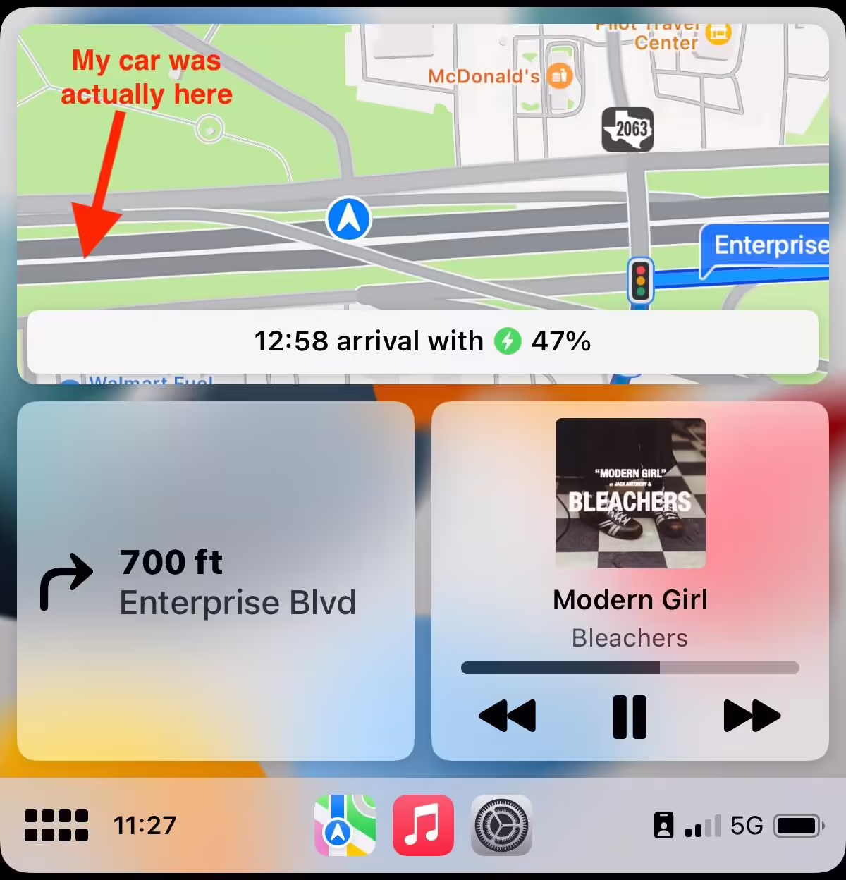 其次,GPS 位置会乱跳,好像发疯了一样。用户明明在高速公路上行驶,但 CarPlay 显示自己在田野里开车,或者在河里开车,或者离自己实际位置很远。定位会不断地跳来跳去,这也完全破坏了导航功能。苹果地图或谷歌地图会混乱地给出错误的指示,以为用户偏离了原来的路线。