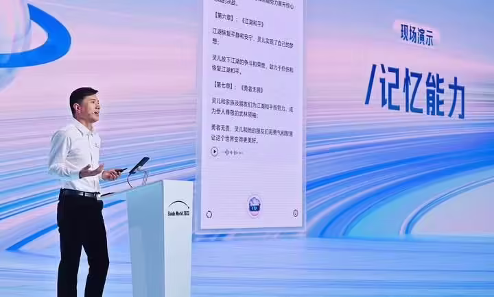 李彦宏通过撰写武侠小说展示文心 4.0 的记忆能力。据现场演示,文心一言不仅可以快速撰写出武侠小说的故事大纲,还能持续增加角色、增加戏剧冲突,并将第四、五轮的生成内容与首轮小说框架结合,对故事细节“比现场观众记得还牢”。