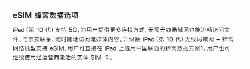 苹果公司声称,用户可直接在 iPad 上选用中国联通的蜂窝数据方案,也可以继续使用经运营商激活的实体 SIM 卡。