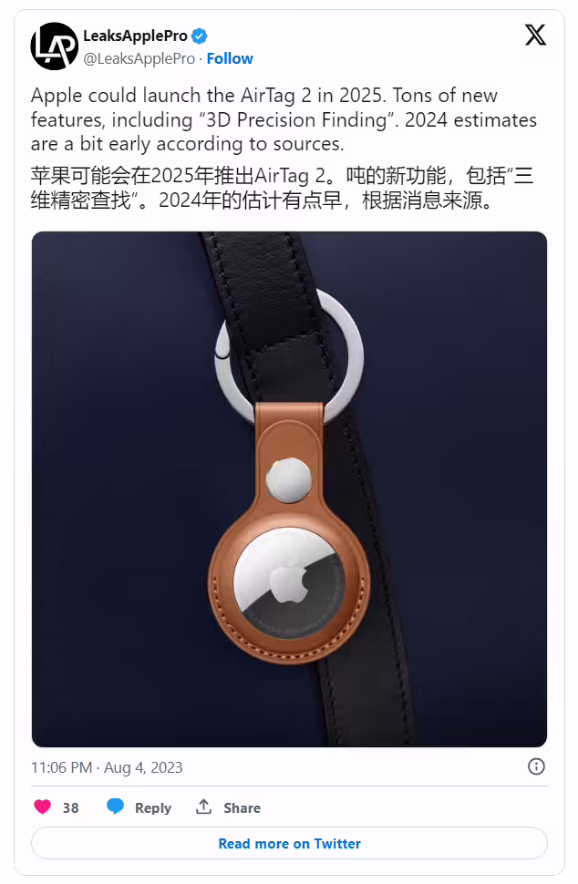 郭明錤此前表示认为苹果正计划在空间运算的基础上建立一套新的生态系统,并希望以 Vision Pro 为核心整合其他设备,包括 AirTag 2。他表示,苹果 AirTag 2 可能会在明年第四季度量产。 今年 8 月援引另一位消息源 @LeaksApplePro 报道,他认为苹果会在 2025 年推出 AirTag 2 追踪设备,现在郭明錤也修正了自己的预估,两者现在的爆料均指向了 2025 年。