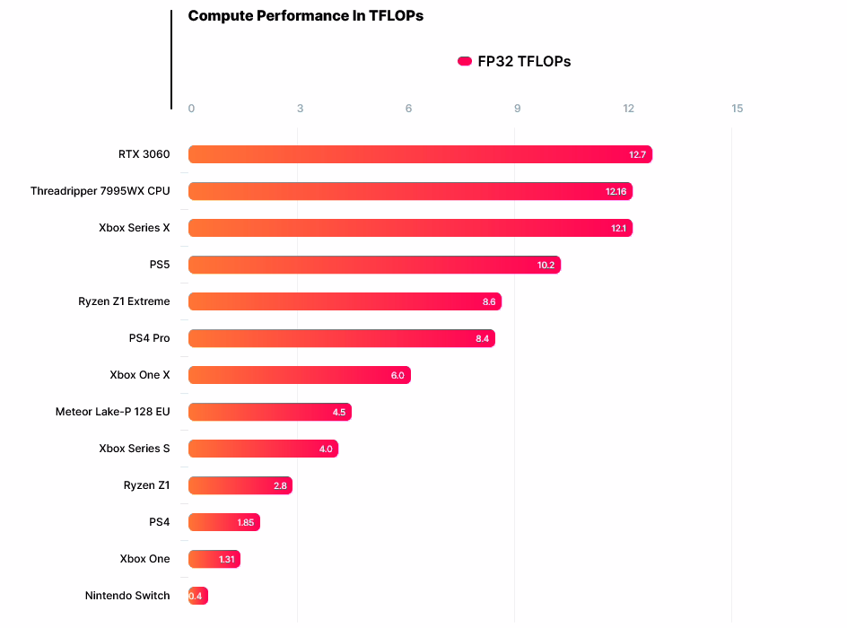 AMD Ryzen Threadripper PRO 7995WX CPU 不仅在原始 TFLOP 方面领先于两款游戏机,而且和英伟达 GeForce RTX 3060(12.7 TFLOP)相当。 |