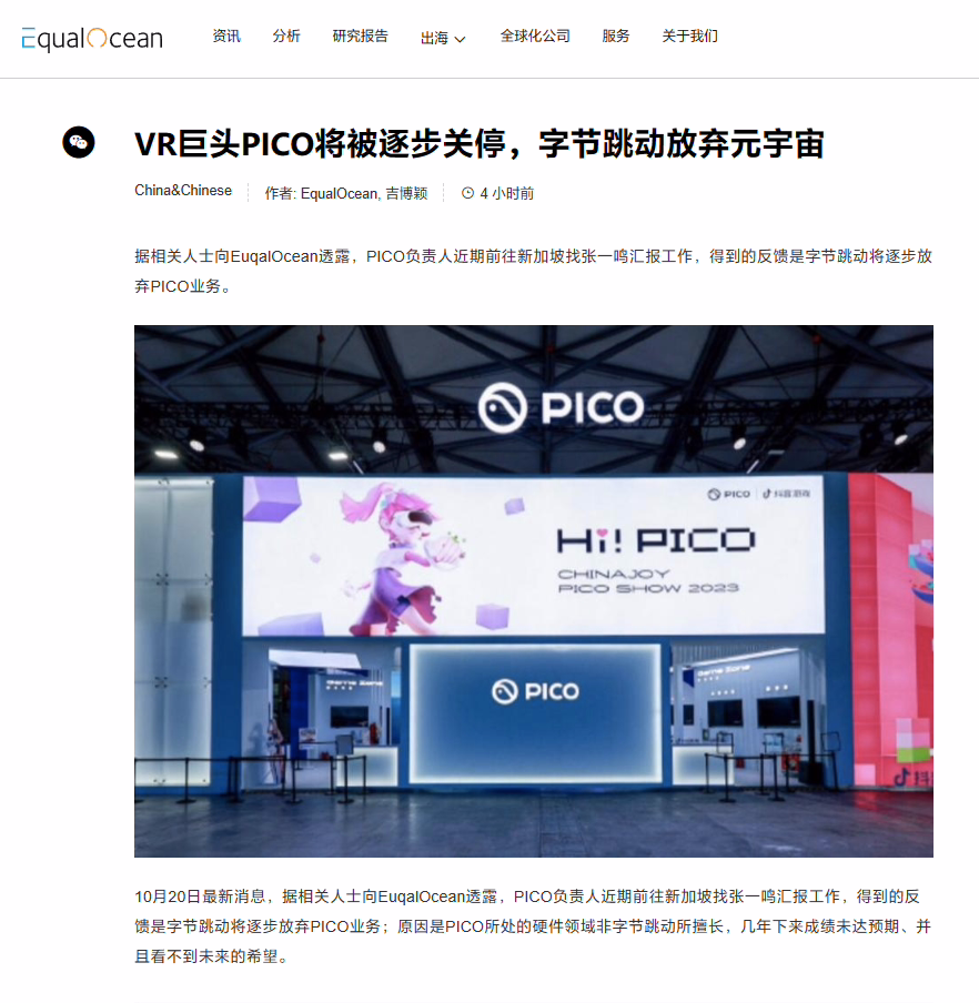 附前情提要: 今日早些时候,媒体 EqualOcean 发文声称“VR 巨头 PICO 将被逐步关停,字节跳动放弃元宇宙”,文章引述“相关人士”的说法称,PICO 负责人近期前往新加坡找张一鸣汇报工作,得到的反馈是字节跳动将逐步放弃 PICO 业务,并称原因是“PICO 所处的硬件领域非字节跳动所擅长,几年下来成绩未达预期、并且看不到未来的希望”。