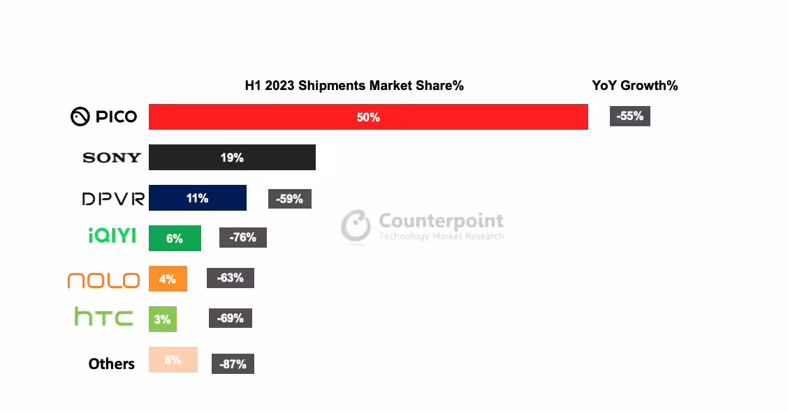 PICO 成立于 2015 年 3 月,2021 年 9 月并入字节跳动。根据市场调查机构 Counterpoint Research 公布的最新统计报告,2023 年上半年我国 VR 头显设备出货量大幅下降 56%,结束了 2021-2022 年的连续两年增长。其中,PICO 占有约 50% 的巨大市场份额,然而,Pico 在 2023 年上半年也经历了超过 50% 的同比下滑。