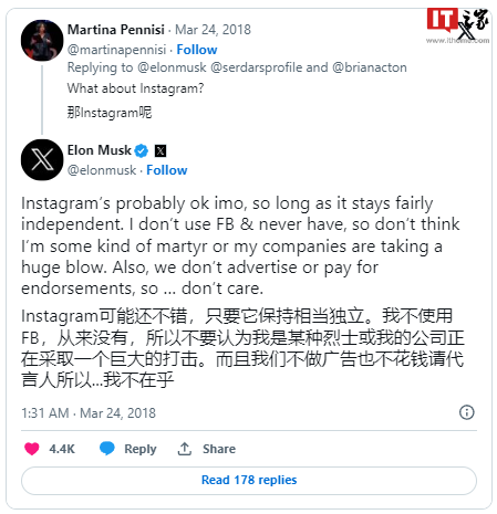 2018 年 3 月,马斯克删除了特斯拉在 Facebook 的页面,他后来澄清说,这么做只是因为不喜欢 Facebook,他个人从未使用过 Facebook,他的公司也不会在该平台投放广告或寻求代言。马斯克称,“我就是不喜欢 Facebook。让我毛骨悚然。对不起。” 实际上,马斯克收购 Twitter 之前就一直对 Facebook 持批评态度。他曾公开表达过对 Facebook 的厌恶,并鼓励人们删除账户。本月早些时候,马斯克还指控 Facebook 和谷歌存在严重的政治偏向。 2023 年,马斯克与 Meta Platforms CEO 马克・扎克伯格 (Mark Zuckerberg) 之间的一场口头争执差点升级为肢体冲突。这两位亿万富豪开玩笑地提出进行一场笼斗比赛,起因是马斯克指责扎克伯格和 Meta Platforms 抄袭了 X 平台的产品。 |