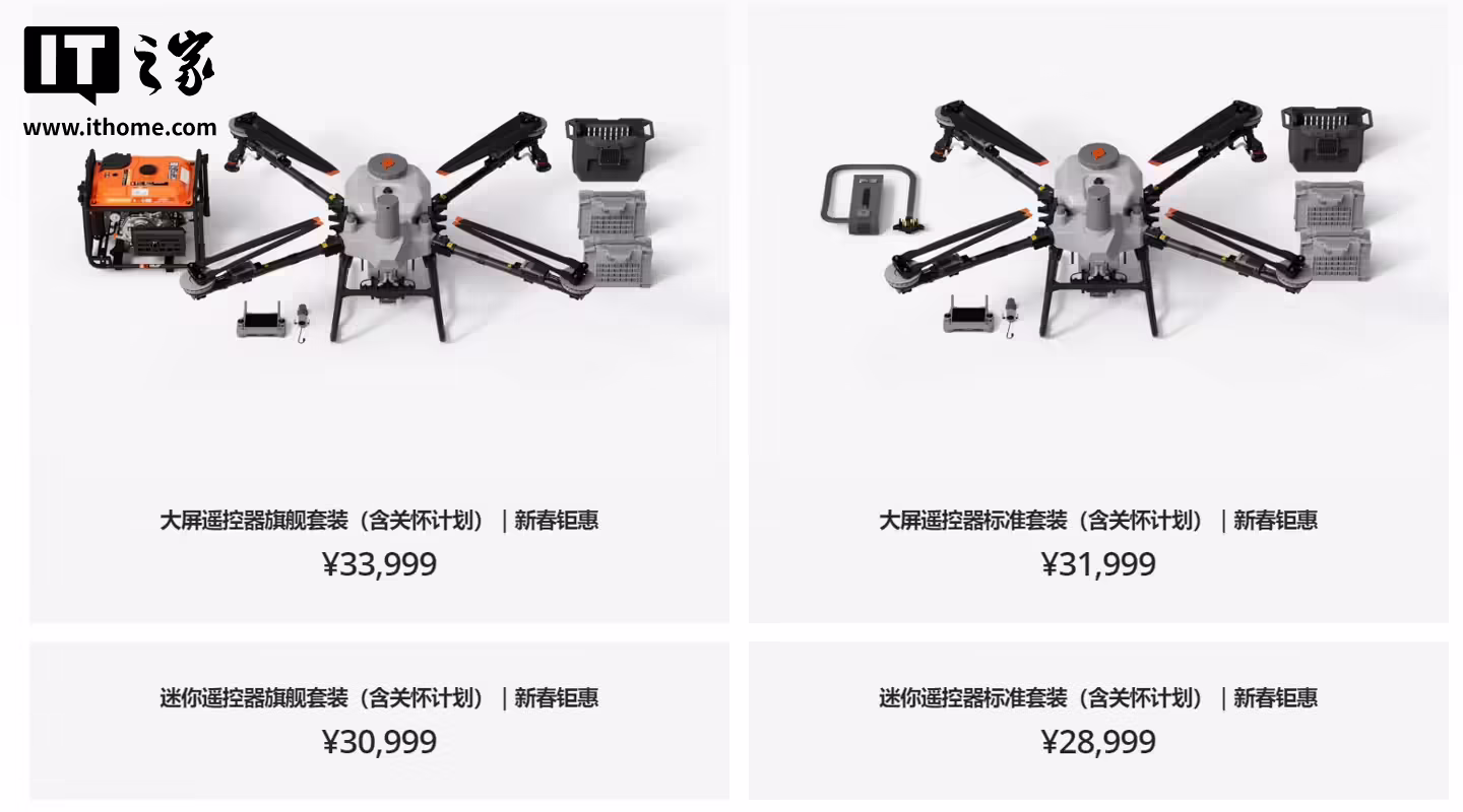 查询大疆农业官网获悉,T100S 和 T70S 农业无人机可选多个套装版本,首发价分别为 40999 元起和 35999 元起。