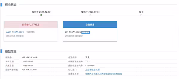 12 月 3 日消息,工信部官网显示,标准号 GB17675-2025《汽车转向系 基本要求》国家认证标准正式发布。新标准自 2026 年 7 月 1 日起将会全部代替此前的“GB17675-2021”标准。