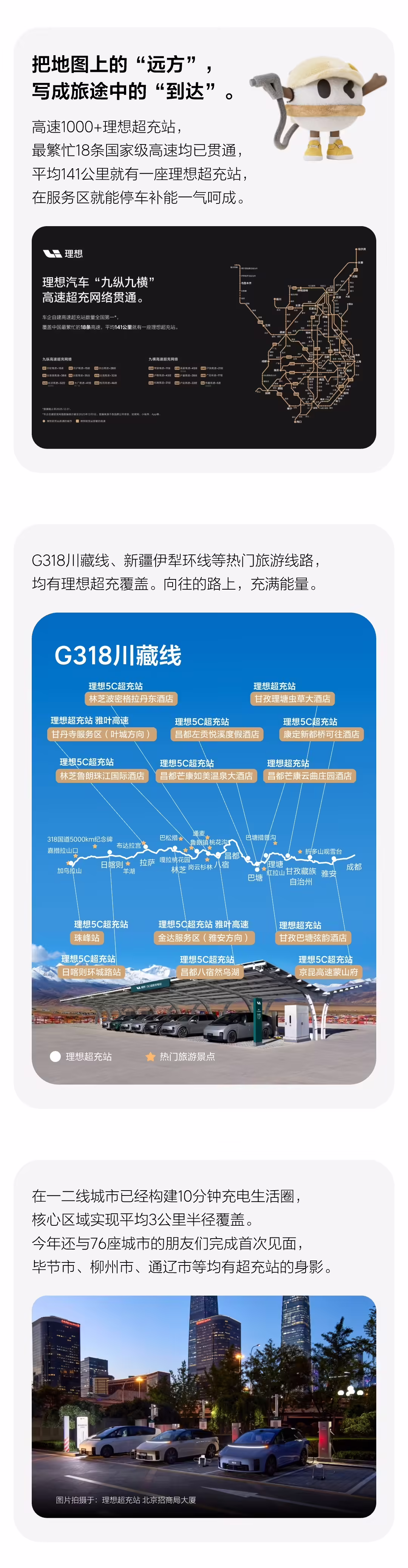 据介绍,目前已经有超过 1000 座高速理想超充站,最繁忙 18 条国家级高速均已贯通,平均 141 公里就有一座理想超充站。G318 川藏线、新疆伊犁环线等热门旅游线路均有理想超充覆盖。在一二线城市已经构建 10 分钟充电生活圈,核心区域实现平均 3 公里半径覆盖。今年还与 76 座城市的朋友们完成首次见面。