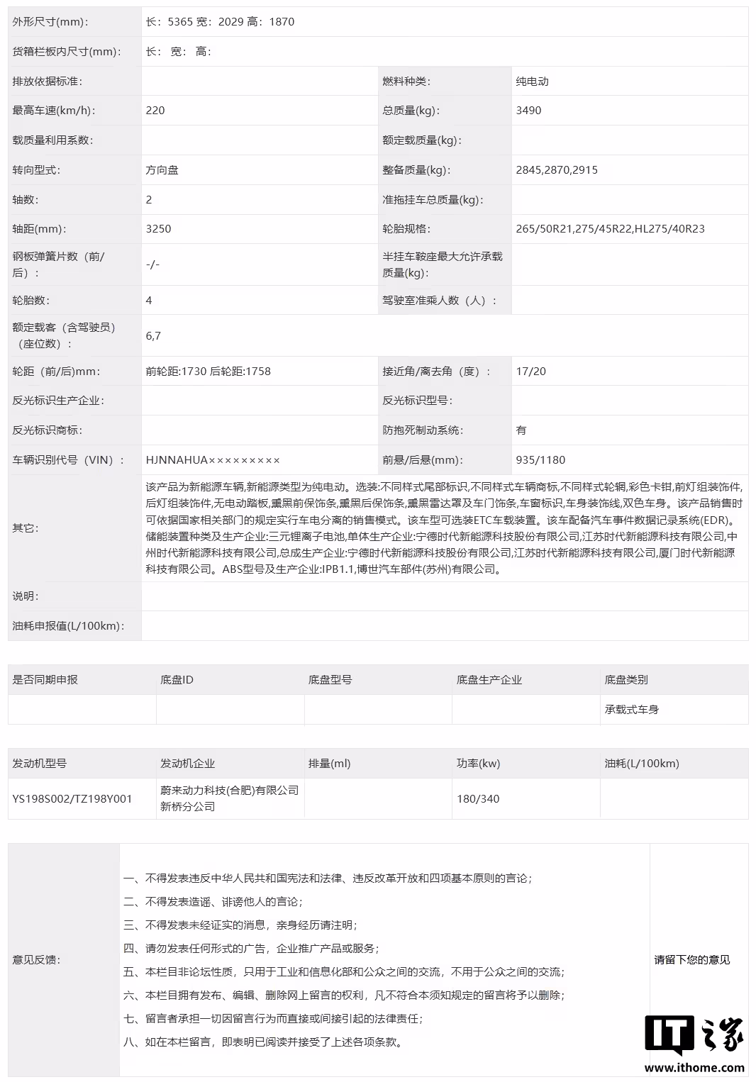 1 月 19 日消息,1 月 18 日,蔚来联合创始人秦力洪透露,蔚来 ES9 大概会在 4 月 10 日举行产品技术发布会,并将于二季度正式上市。蔚来创始人、董事长、CEO 李斌表示,相信蔚来 ES9 会成为同价位里最有竞争力的纯电车型。 该车已在本月初登陆工信部《道路机动车辆生产企业及产品公告》(第 403 批)的车辆新产品公示清单,汇总主要参数信息如下: