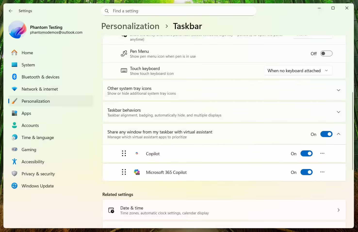这一设计理念旨在省去手动向 AI 助手进行屏幕共享的繁琐过程,让 Windows 系统能够在用户许可下,直接将实时应用窗口传递给 Copilot 或 Microsoft 365 Copilot。此举与微软将任务栏打造为 AI 动态中心的战略规划相契合。 微软此前已在测试“Ask Copilot”功能,该人工智能功能有望取代传统的 Windows 任务栏搜索,提供一键调用 Copilot 语音与视觉能力的入口,其中视觉能力可让用户向 Copilot 共享屏幕并执行相关任务。 然而,“从任务栏与虚拟助手共享任意窗口”的开关是微软将 Windows 打造为“智能体操作系统”更宏大计划的一部分。从目前情况看,这一功能区域不仅限于 Copilot,未来还可能纳入更多 AI 智能体。 Windows 爱好者 @phantomofearth 发布的截图显示,新的任务栏设置中出现了“从任务栏与虚拟助手共享任意窗口”选项。这个开关似乎是微软此前以“与 Copilot 共享”为名测试功能的系统级设置入口。