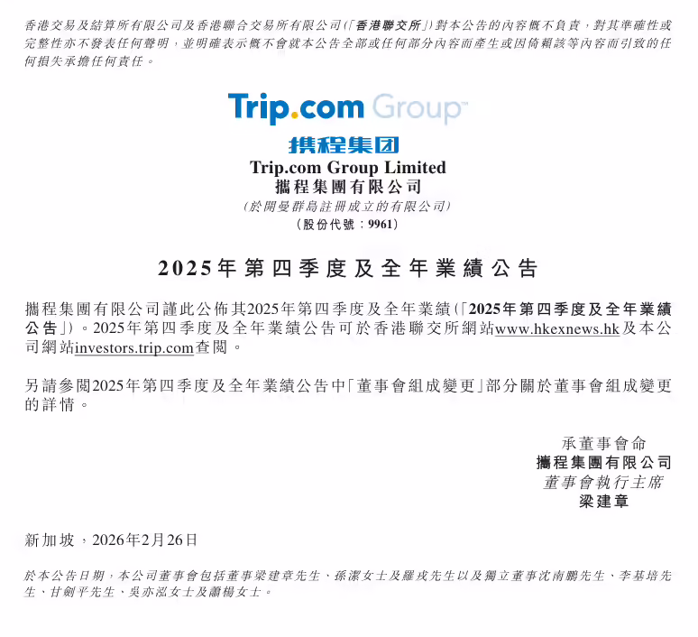 2 月 26 日消息,今日,携程集团在港交所公布 2025 年第四季度及全年未经审计财务业绩。 财报显示,携程集团 2025 年全年国际 OTA 平台总预订同比增长约 60%,全年服务入境旅客约 2000 万人次。2025 年第四季度,携程集团净营业收入为 154 亿元人民币,同比上升 21%,主要得益于旅游需求的韧性。净营业收入环比下降 16%,主要归因于季节性因素。2025 年全年,净营业收入为 624 亿元人民币,同比上升 17%。