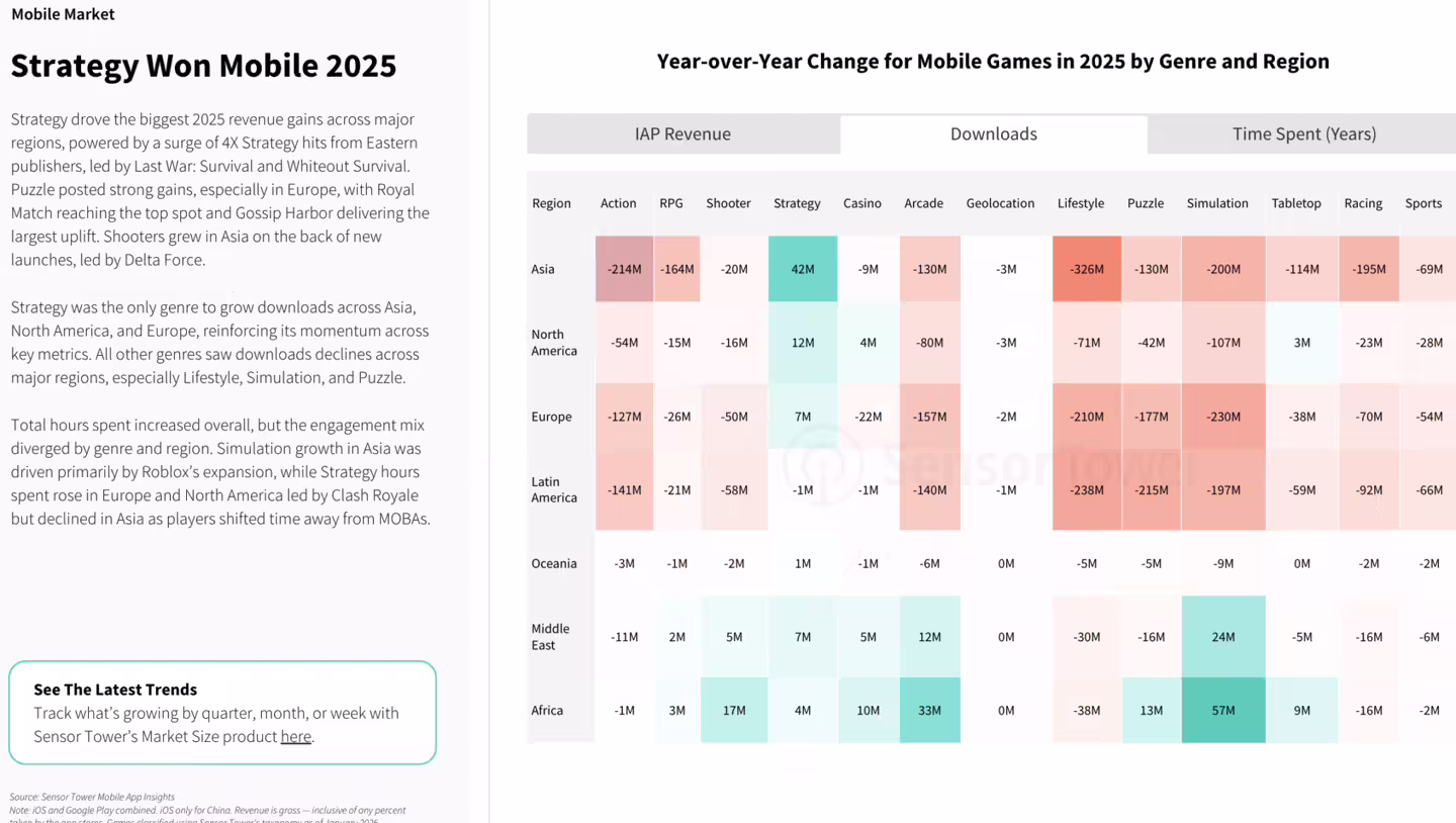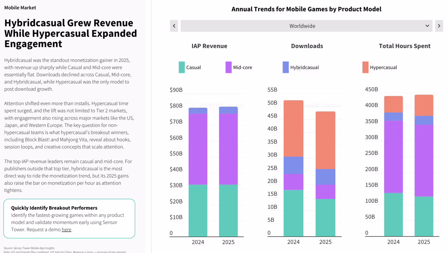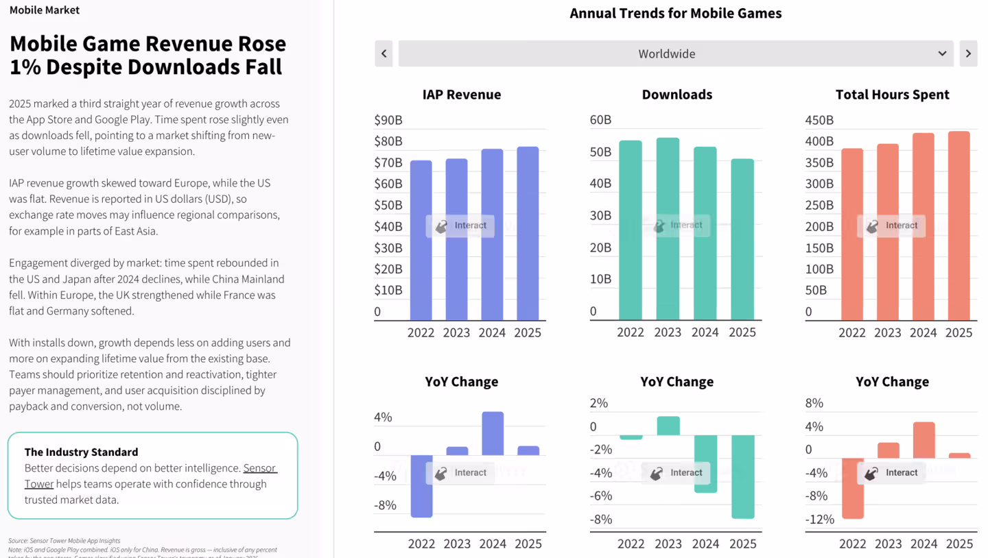 2 月 26 日消息,数据分析公司 Sensor Tower 昨日发布《2026 年游戏行业现状报告》,全面盘点了 2025 年全球游戏市场表现。 在游戏时长方面,整个移动市场在 2025 年迎来了历史性转变,消费者在非游戏类应用上的支出首次超过了游戏,不过全球玩家的游戏总时长依然高达 4446 亿小时。