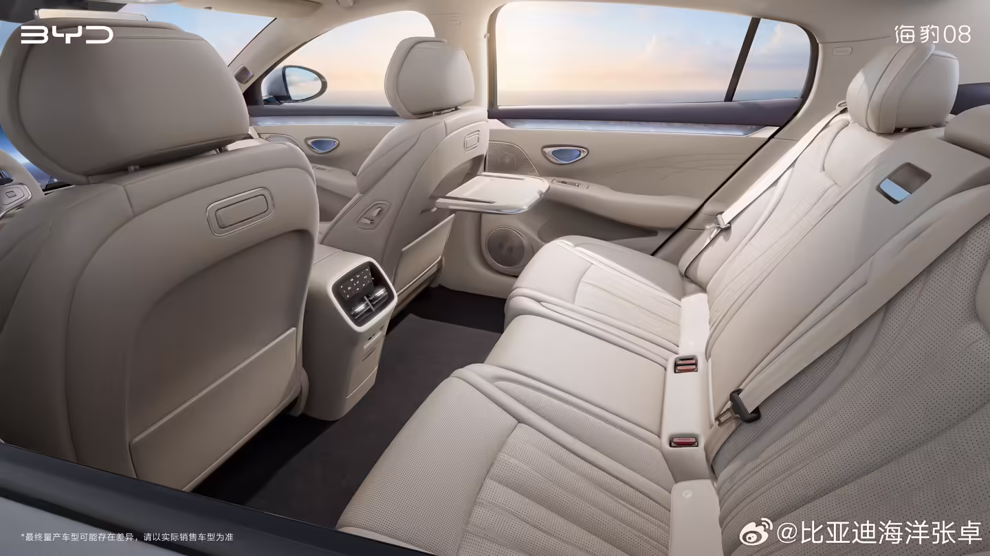图片显示,新车内饰具有简约豪华的气息,中控台层次分明,配有较宽的贯穿饰条增添精致感。该车方向盘酷似鱼尾,线条流畅,并配有大量实体按键。 从配置来看,新车预计配有前排双零重力座椅、车载香氛、后排空调独立控制、后排小桌板及座椅后排的平板支架等。值得一提的是,新车后排座椅也拥有较大角度,不过目前暂不明确是否可调。 汇总海豹 08 目前已知的信息如下: 新车集闪充、后轮转向、第二代刀片电池等多项前沿技术于一身,将于今年第二季度正式上市。