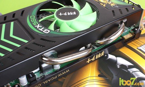 从外观我们能够明显的感受到GTX560黑将独特的魅力--“双子星”散热系统。在保证显卡的性能的前提下,散热系统的噪音非常低,而且温度十分可观。散热系统的直径为90mm,而从显卡支架到散热风扇中心的高度为15mm,风扇规格比市面甚多的产品优异,在保证低噪的前提下,为显卡提供十足的风力,并被配备散三热管散热。“双子星”最为特别之处是风扇采用“y”字型支架,相较普通的“正三角”支架,能够提供更多的鳍片面积。采用“双子星”对于显卡来说,无疑提供一个非常优异的散热平台,为显卡腾了广阔的超频空间。