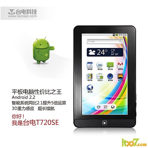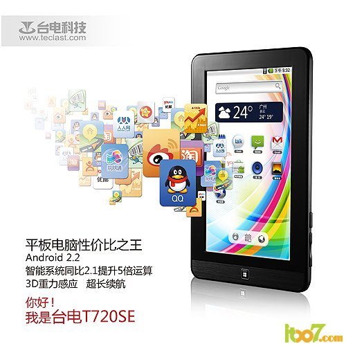 台电T720SE采用最新的Android 2.2智能操作系统,程序运行速度比2.1提升5倍以上,具有最好的软件兼容性,内置全新的网页浏览器可获得更佳的上网体验,支持重力感应等新特性,运行速度更快捷。拥有超过30万款应用程序可以使用,包罗万象,无论是上网、新闻、游戏、邮件、聊天、办公、娱乐、电子书、教育、医疗健康、工具等等各种应用都极其丰富,覆盖生活的方法面面。