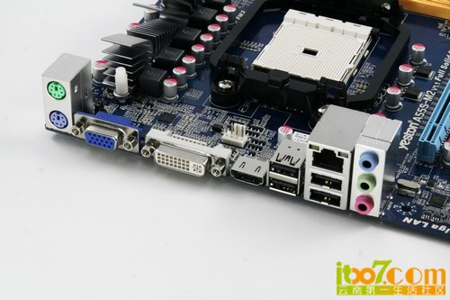 盈通A55S-M2提供1组PS/2键盘/鼠标接口,D-sub/DVI/HDMI集成显示接口,4个USB2.0接口,千兆网卡及6声道音频接口。