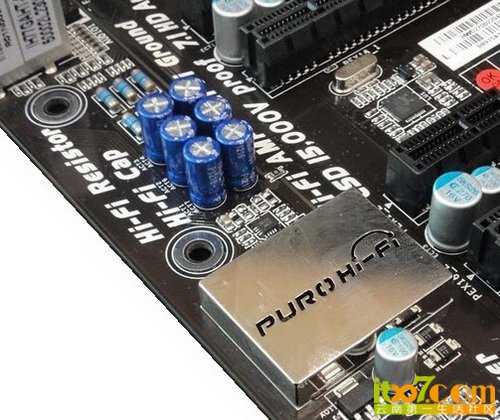 作为一款Hi-Fi级别的主板,音频方面自然不可小窥。该主板在音频芯片上采用了金属屏蔽磁环,能够有效隔绝来自主板其它元器件的电磁干扰。映泰Hi-Fi H77S的音频芯片采用了Realtek ALC 898,可能很多用户会说这个芯片应用很广泛,为什么说是Hi-Fi级别的?其实音效很大程度上并不由芯片所决定,而是由很多其它因素决定,比如电路设计,运放芯片,电容等等。该主板采用了无极电容及金属氧化膜电阻,稳定、低杂音且收干扰程度小。另外由于映泰扎实的主板走线功力,因此在音质上非常有保障。