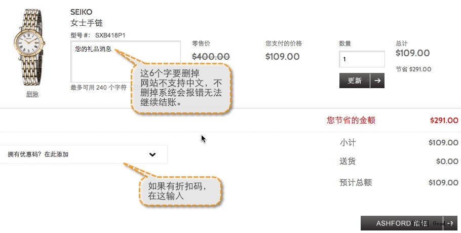 买手表,美国海淘很划算,不但没有假货,价格也比国内便宜很多,打折时也就是国内的一半甚至1/3,并且越贵的表差价越大。 美国Amazon打折频次少些,但GPS表、心率表打折较多,这种户外表一般都去美国Amazon。Ashford和JOMASHOP是专卖名表的网站,主卖瑞士、日本名表、潮流品牌的时装表,每周都搞促销。 如果非要把这三家网站分出高下,Ashford是毫无争议的老大: 1、Ashford网站有中文界面,链接zh.ashford.com 2、Ashford满75美元(460 RMB)免费直邮中国,不满75美元则需要支付29.95美元运费。通常2-3周到手,直邮用的是UCS合众速递,运输全程可在EMS网站查询。后面会详细说UCS。 3、Ashford已经在天猫开店,链接ashford.tmall.hk 4、Ashford有中文客服 在Ashford买表,要分成三部分看:天猫店、中文网站、美国网站。 Ashford天猫店:2013年12月开业,手表款式比较少,但双12促销时有额外折扣,当时很划算。需要注意的是,在天猫店买,也是从美国发货,到货周期和海淘一样。满460元包邮,不包关税与增值税。 Ashford中文站海淘攻略(另有之前写的Ashford网站介绍) 所谓的中文站,只是把菜单翻译成中文界面,购买过程依然和海淘一样 ▲打开Ashford,点页面右上选择中文,确认后,网站就变成中文页面,域名也变成zh.ashford.com开头。 ▲再点右上角的『登录/注册』→『创建我的账户』,到达注册页面。注册时,最重要的是邮箱,以后都得用邮箱登录。名字随便写,邮编、国家、州(省)需要用英语必填。注册后就是找到商品并下单 ▲下单前,需留意腕表尺寸与库存状态,『现货即发』的才能直邮中国,购买时『加入购物车』即可。另外商品编号其实很重要,搜索这个编号就能直达这件商品。 ▲如果选择尺寸后变成『Temporarily Out Of Stock』,那就是不支持直邮中国。 直邮不行时候,只能走转运。方法是重新注册账号,邮编和国家地区都选择美国的,收货与账单地址都留美国转运公司的。 注意事项:只要是Ashford页面显示的尺寸,其实都有货,不让选只是不卖到中国而已。切回英文页面,会发现这个尺寸就能选了。这种情况,虽然可以先加入购物车,再切回中文界面,也可以下单,但仍旧会被砍单。 ▲再加入购物车后,注意礼品消息那,务必把系统默认的『您的礼品消息』,否则下单会报错,说系统不支持中文……因为网站中文页面是程序翻译过来的,所以对中文支持并不好。 以下是重要的结账环节 ▲上图中是收货地址的填写方法。注意先选择UCS送货(第三个),再填地址。 到了这里,也就是到了最重要的结账页面,一共分为三步:『送货』也就是收货地址;『开票』也就是支付方式,必须是双币卡,不支持银联,第三步就是核对无误后确认。 『开票』:输入信用卡信息。名字,要与信用卡卡片上的一样;安全码,AE卡填卡片正面的4位,别的卡填卡片背面的3位。信用卡的账单地址,选择与收货地址相同就行,Ashford不验证账号地址,随便写。如果没意外,其实就下单成功了。 下单成功后,就是等着收货了,包括 发货周期、转运周期、国内送货。 发货周期:一般Ashford会在1-3个工作日内发货,注意是工作日,老外周末与节假日准时休假,绝对没人干活,所以黑五的时候就拖了7天才发货。 转运周期:UCS和百通、转运中国一样,是转运公司,只不过曾经与EMS有些关系,自称是中国邮政的海外代理,也可以在EMS网站直接查询UCS的订单。但据传支持UCS的某位老领导已经退休,现在UCS也是小心谨慎的运作。UCS从美国发货到国内,一般10天居多,慢的话也就是2周。 国内快递:在Ashford买的手表,UCS会从美国发到中国广州,在广州清关,通常要2-3天,慢的时候一周。清关后会由EMS经济件负责国内快递,经济件较慢,石英表电子表都走陆运,一般得一周到手。 总的说,从Ashford买表到手,快的时候接近2周,多为2-3周之间,慢的时候接近一个月,算下来和转运速度差不多。 下单过程中出问题怎么办 Ashford网站对中文支持的不好,有时打开速度也很慢,一旦出现问题,建议切换到英文页面,切换后有时需要重新登录。我一般会用两个浏览器,同时开着中文与英文界面,参照中文页面,在英文界面里下单。下单后,会收到Ashford发来的邮件,信用卡也会扣款(只是先冻结,没先扣钱,如果被砍单并不会扣钱的)。 到现在,还不能说下单成功,因为每个订单都需要Ashford的人工审核,建议再观察10-30分钟,如果系统里面你这订单消失,说明被砍单了……得继续想办法,如果订单状态发生变化,才算真正成功。一般来说30分钟后还没砍单,也就没问题了。 被砍单了怎么办 以前Ashford几乎不会砍单的,但从中文网站开始运营后,Ashford的中文站就是『站中站』,只有一部分商品在中文页面下可以很买,很多好的折扣中文下不让下单,下单也会被取消。 小编经历过:英文界面下单,直邮中国,被砍单。英文界面下单,发转运,被砍单。注册新账号,国家填美国,留转运地址,还是原来的信用卡,成功。 所以建议在Ashford注册两个账号,首选中国地址+直邮,美国地址+转运当作备用。 在Ashford买表的注意事项 1、折扣码与砍价 Ashord很多时候不是直接打折,需要用折扣码才打折,一般价格网推荐的时候,有折扣码的都会带上。如果想买没折扣的手表,可以找Ashord客服砍价……没错,是砍价,只要你的英语足够好,Ashord中文站这边能否砍价我还没试过,应该也成。 2、机械表需要注意质量 Ashord网站手表折扣大,因为都是库存尾货,如果买机械表的话,库存表其实有